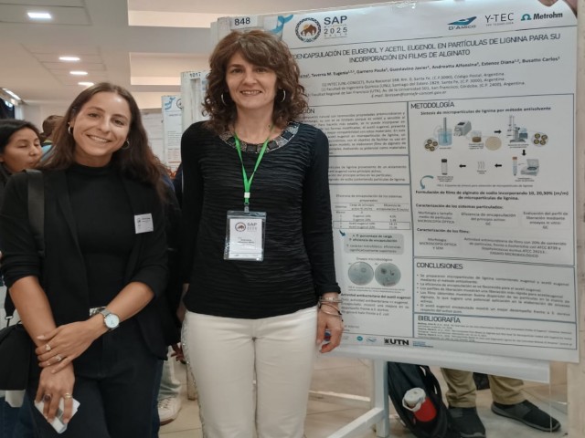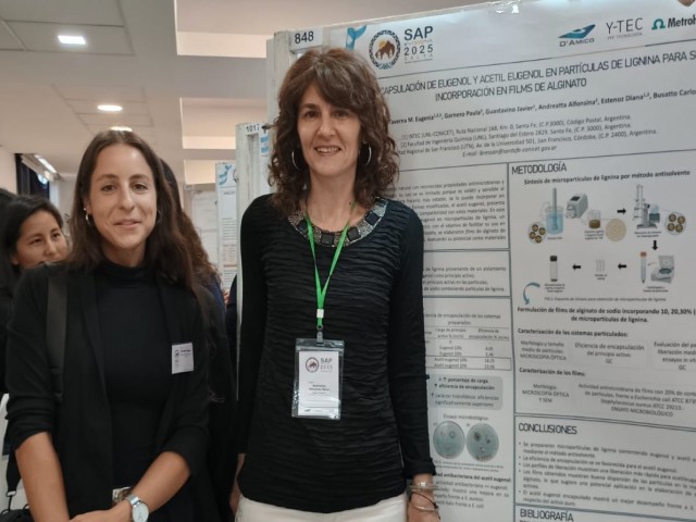 “Microencapsulación de eugenol y acetil eugenol en partículas de lignina para su incorporación en films de alginato”, desarrollado por Luisina Bressán, M. Eugenia Taverna, Paula Garnero, Javier Guastavino, Alfonsina Andreatta, Diana Estenoz y Carlos Busatto. Esta investigación aborda el desarrollo de sistemas bioactivos con potencial aplicación en envases biodegradables, contribuyendo al diseño de materiales más amigables con el ambiente.